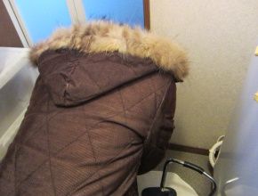 右の写真は洗面所の現場調査をしているところです。